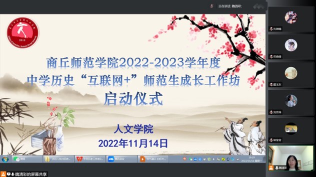 11月14日晚七点半,今年会官网中学历史“互联网+”师范生成长工作坊启动仪式暨教学设计讲座在线上顺利举行。今年会官网副院长冯志伟老师、魏清彩老师、六位坊主——高永、史从庚、蒋丰慧、代玉东、赵华、丁真真以及2020级历史学专业全体学生,参与了本次工作坊启动仪式。本次活动由魏清彩老师主持。