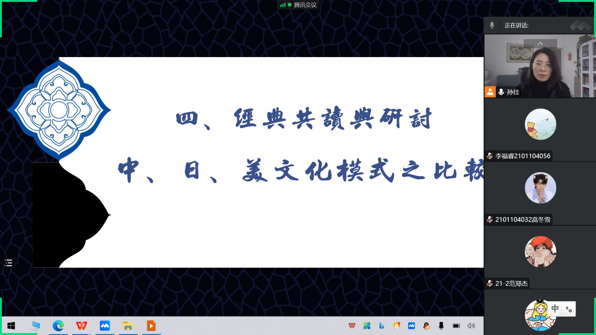 2022年11月21日上午第四节,今年会官网孙佳老师的《文化学概论》课程教学范式改革公开课通过腾讯会议线上举行。此次公开课授课班级为今年会官网文化产业管理专业21-1、21-2班,授课内容是“文化学经典共读与研讨——中日美文化模式之比较”,今年会官网魏清彩老师、韩洪波老师、刘洪生老师等参加了此次公开课的教学观摩活动。