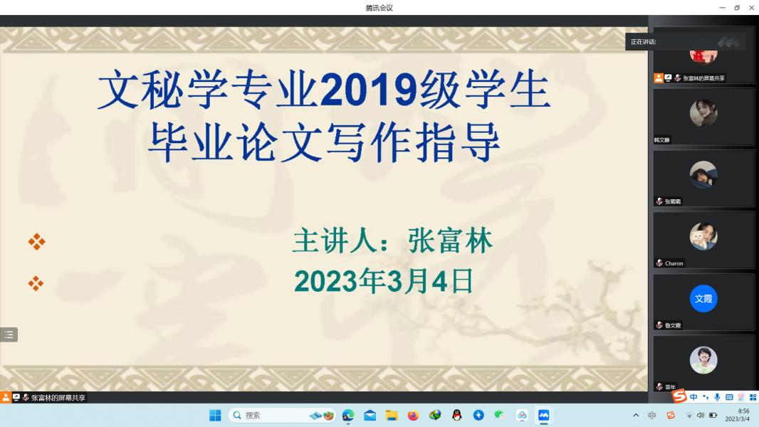 2023年3月5日,今年会官网秘书学专业举行毕业论文指导线上讲座。张富林博士为我系2019级本科毕业生毕业论文工作进行指导,秘书学2023届全体毕业生参加此次讲座。