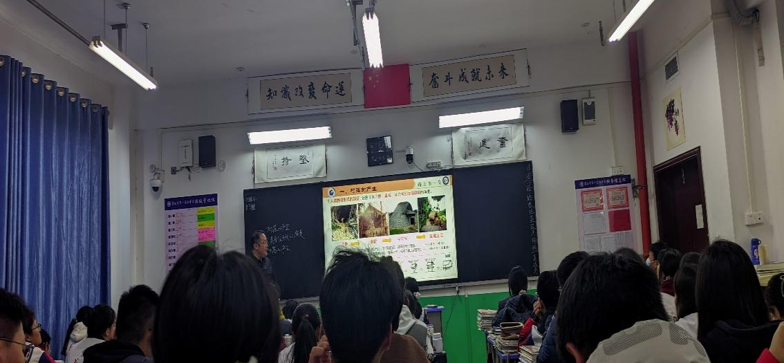 首先是观摩示范课环节。同学们先集中观摩了宋振东老师讲授的一节示范课,教学内容为高中历史选择性必修2《经济与社会生活》第十课《古代村落、集镇和城市》。这一课程是新课改后教材中新增加的内容,因此也让我们这些没有学过本课的坊员感到好奇。宋老师讲解清晰、语言流畅,通过课件演示有序地推进本课题的学习。在讲课过程中,宋老师播放视频介绍吊脚楼这一极具特色的建筑,吸引了班级学生的兴趣,并适时提出问题,学生纷纷起身,积极回答,课堂气氛轻松活跃。当下课铃声响起,一堂充实又精彩的历史课就此结束。