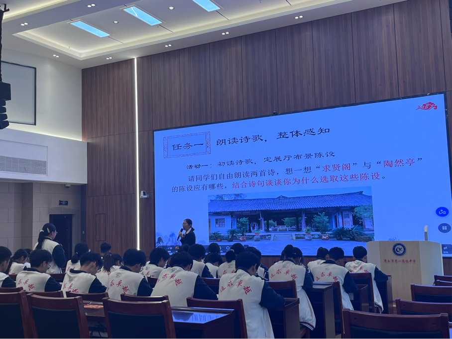 第二位老师讲授了“《短歌行》《归园田居(其一)》联读”,从“在吟诵中感受诗歌的情感之美”“鉴赏诗作中不同的形象美”“在思考中感受诗人不同的人生价值”三个方面展开教学,通过谈话法和讨论法,激发学生的学习兴趣和思维能力,帮助学生深入理解知识。