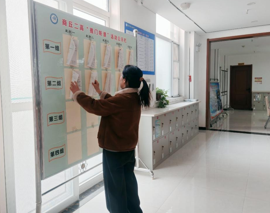 在课前交流中,曹老师首先引导坊员们参观了学校的集体教研室,为坊员们介绍了二高的特色教研活动——“推门听课”制度。之后,坊员们积极与曹老师进行交流沟通,了解当前高中生的学习进程,曹老师给坊员们讲解了跟岗实践和听课的注意事项。