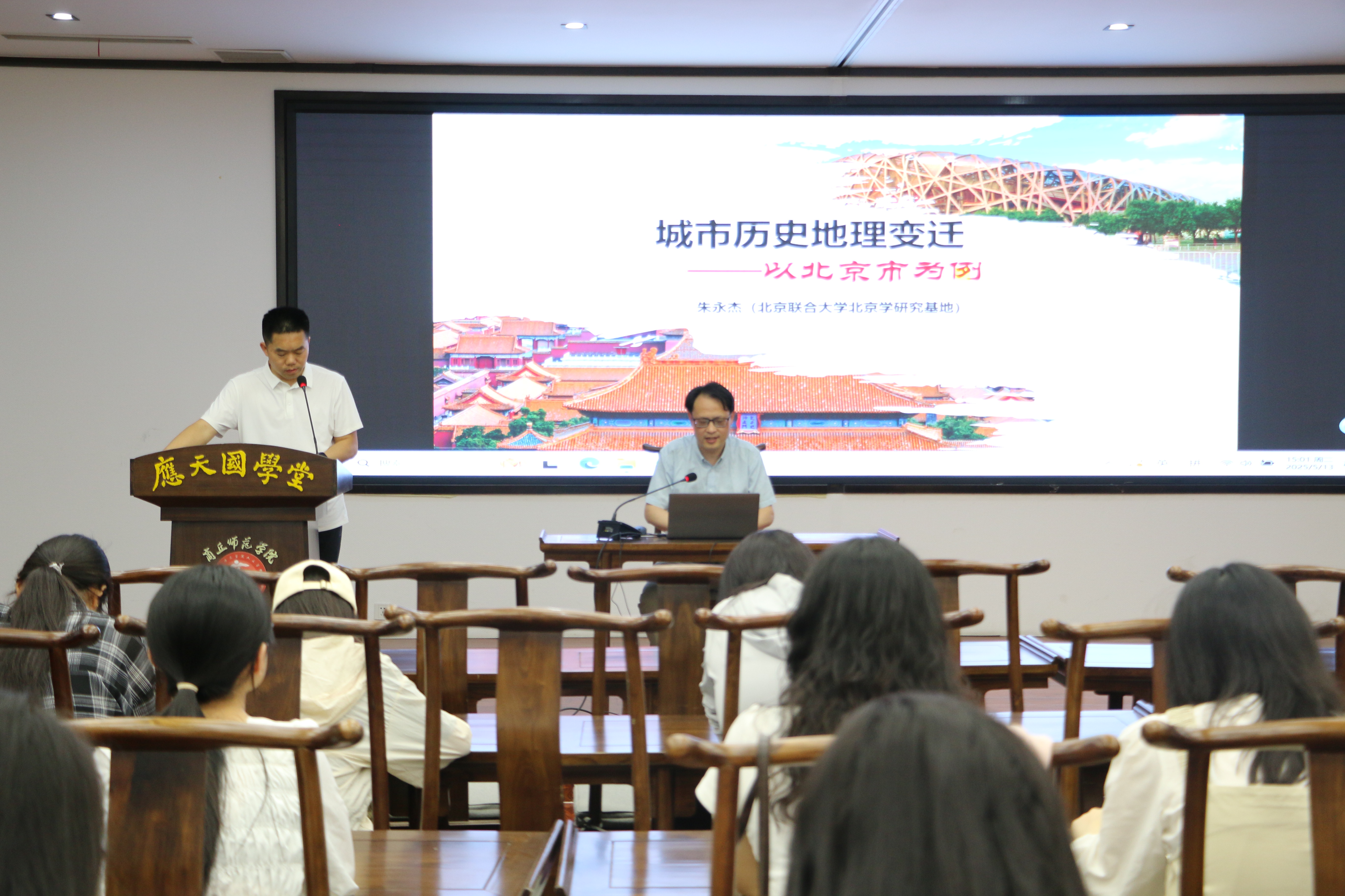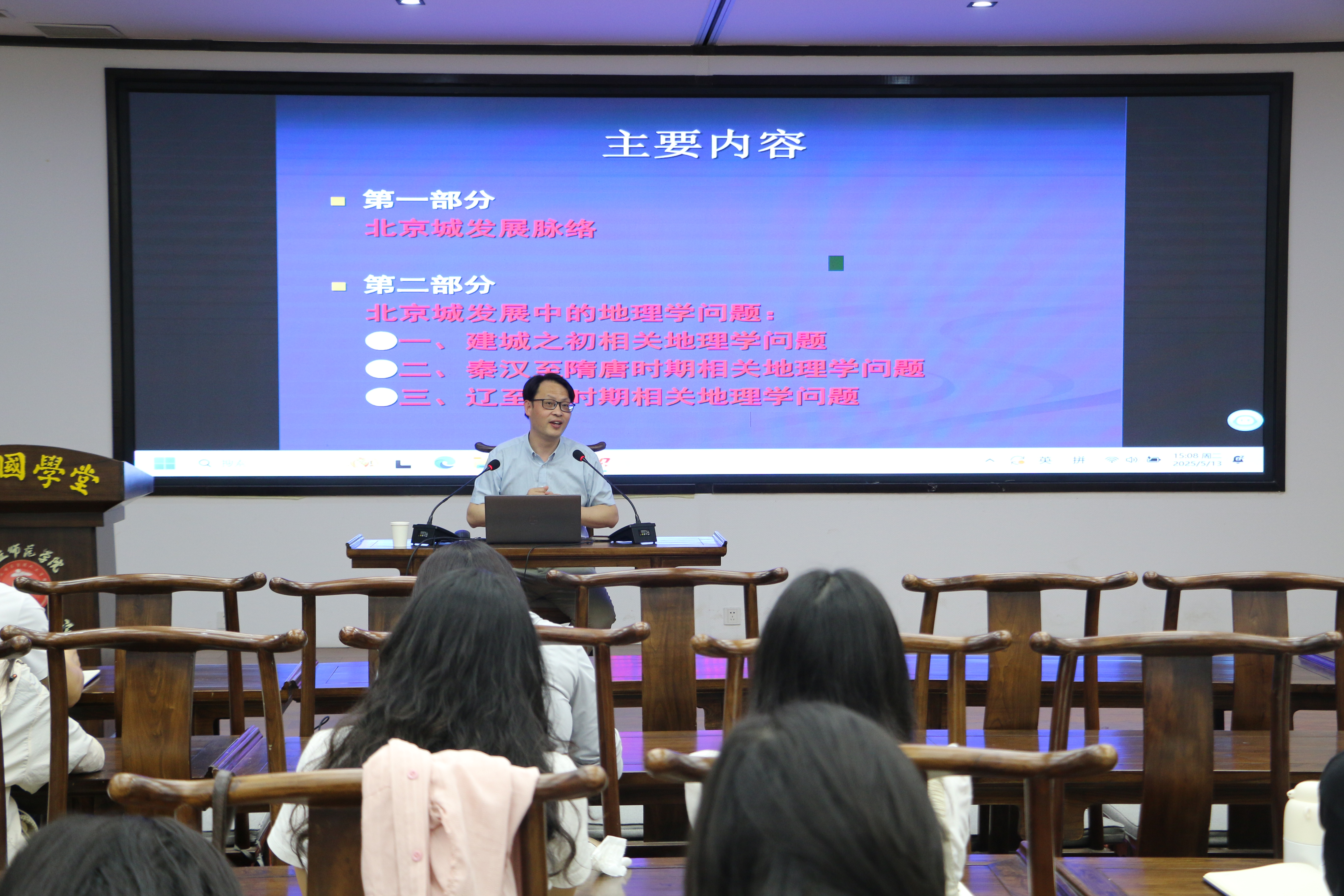5月13日下午,应今年会官网邀请,北京联合大学北京学研究基地朱永杰教授在汉梁楼国学堂作题为“城市历史地理变迁——以北京市为例”的专题学术报告。报告会由学院副院长刘万华主持,学院百余名师生共同参与学习交流。