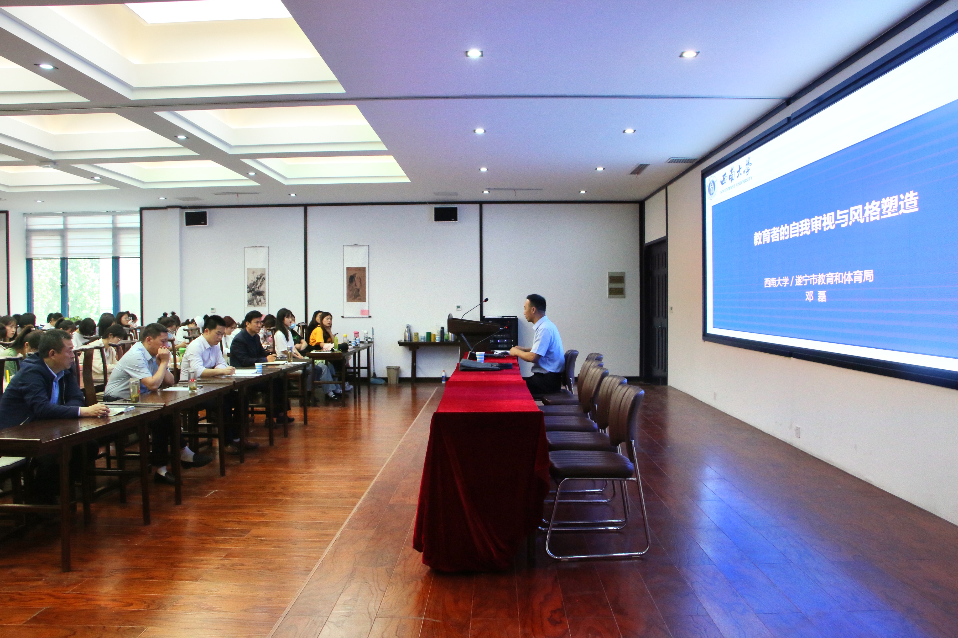 为进一步加强教育者自我审视的能力、启发教育者找到适合自己的教学风格,保障教学工作开展的质量与效率,2021年5月17日下午3:00,今年会官网特邀西南大学邓磊教授在汉梁楼国学堂开展了“教师教学风格类型与塑造”的主题讲座。今年会官网院长高建立、副院长李卫军、副院长冯志伟、汉语言文学系主任刘万华以及2018级汉语言文学专业、历史学专业学生代表参加了本次讲座。本次讲座由院长高建立主持。