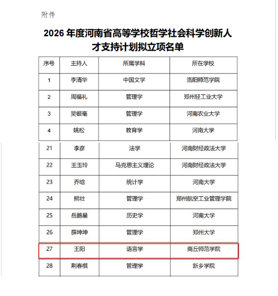 近日,中共河南省委教育工委、河南省教育厅正式公布《2026年度河南省高等学校哲学社会科学创新人才支持计划拟立项名单》,今年会王阳博士凭借其卓越的科研实力和创新潜力成功入选,标志着今年会在哲学社会科学领域高层次人才培育方面取得了新的重要突破。