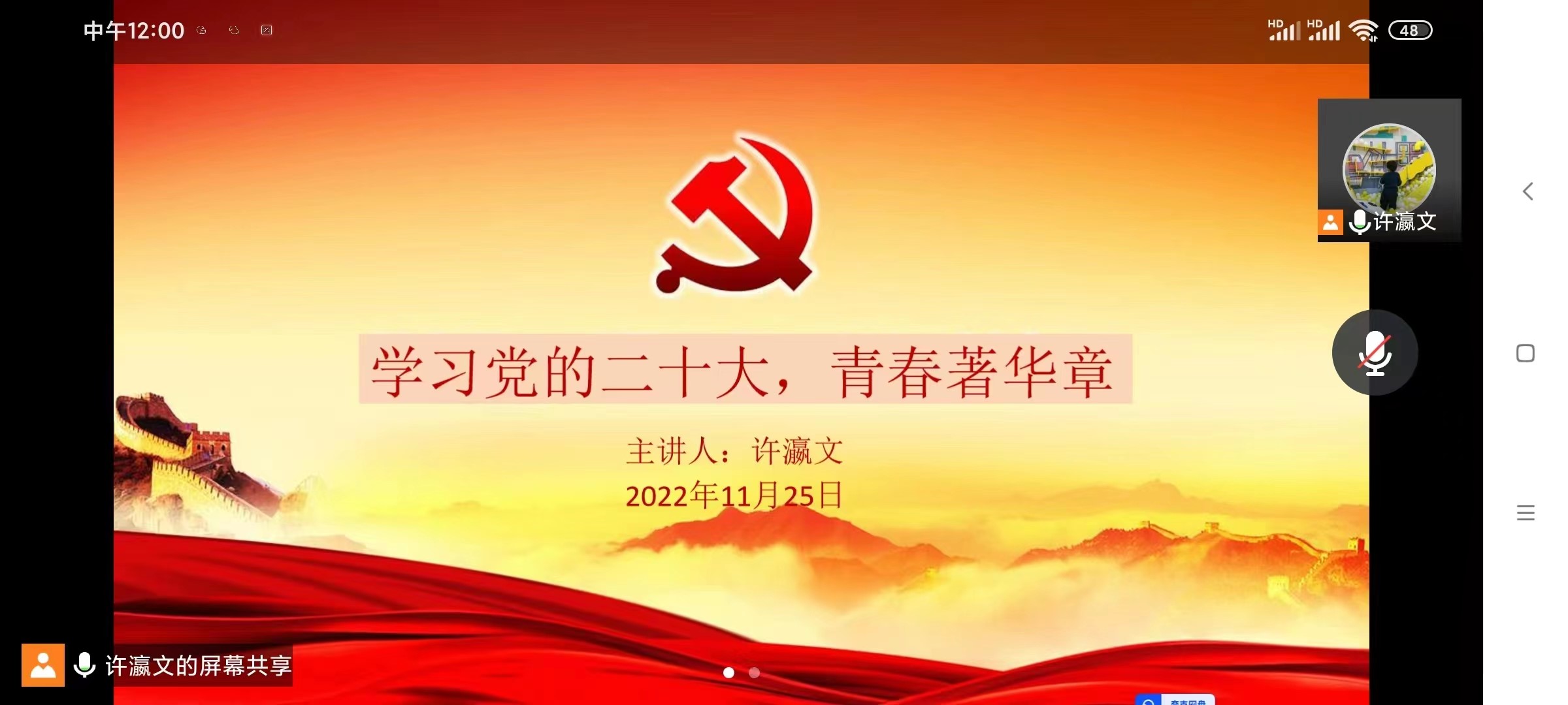 2022年11月25日中午12点,今年会官网学生第三党支部开展“学习党的二十大,青春著华章”主题党课,利用腾讯会议在线上举行,支部书记许瀛文主讲,支部的党员以及入党积极分子代表参加本次党课学习。