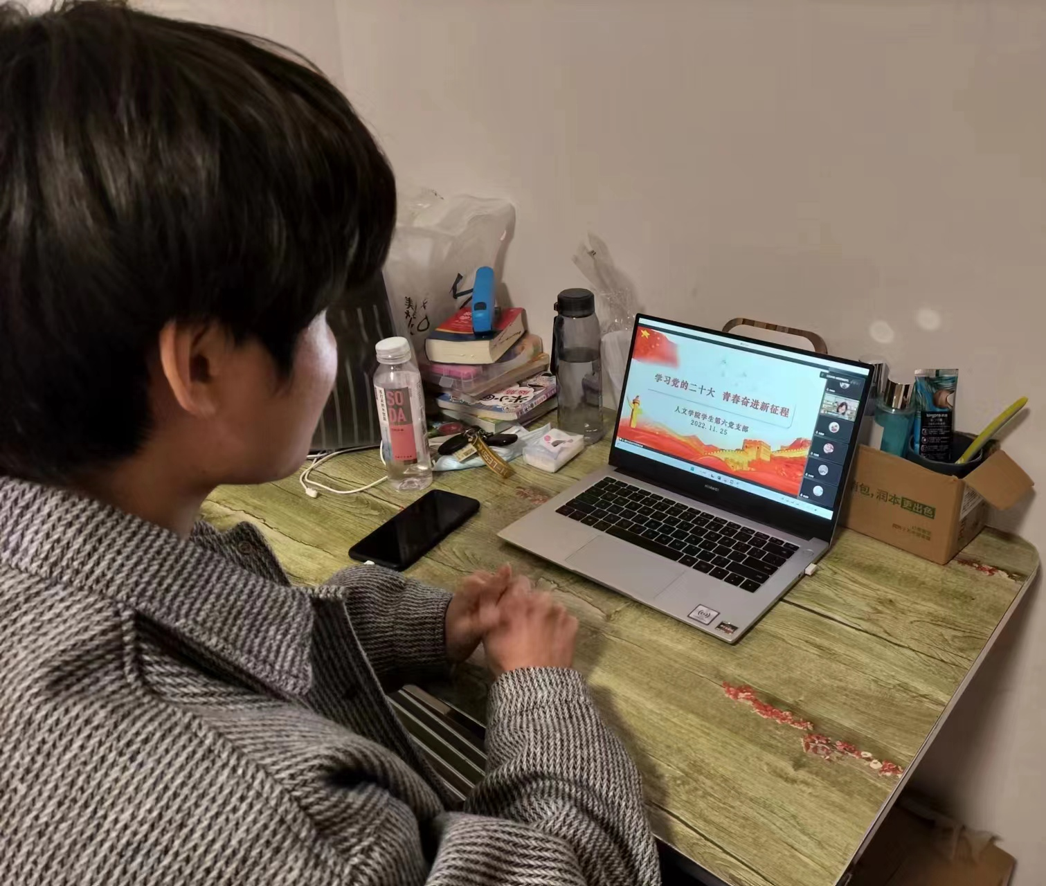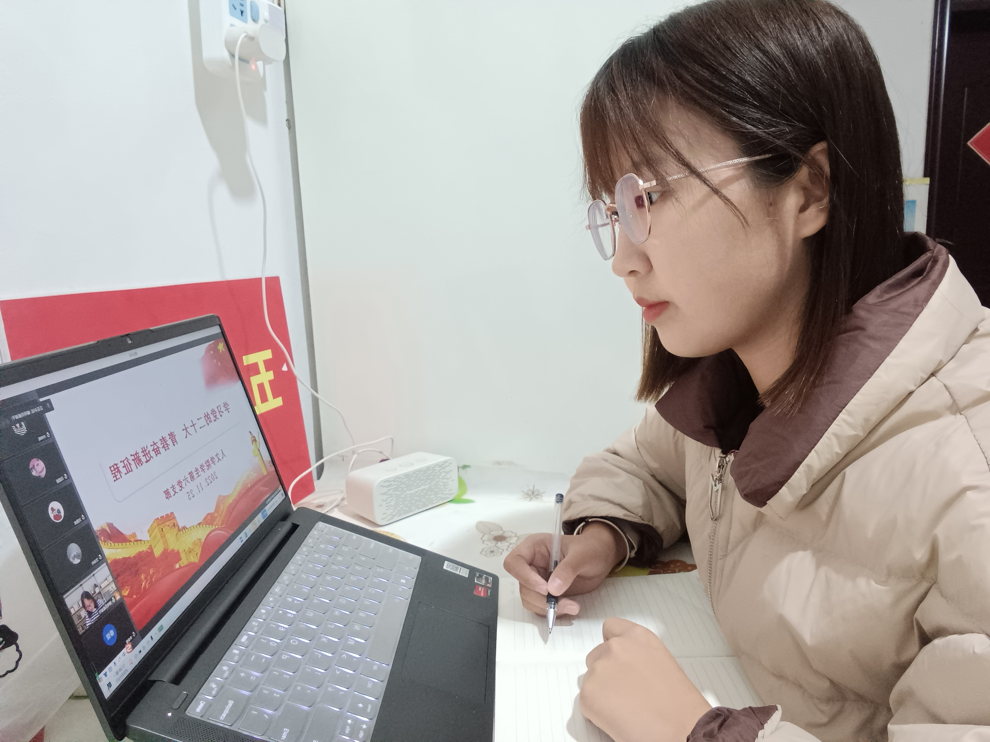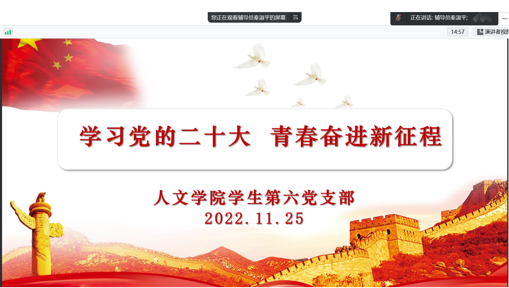 2022年11月25日下午6点,今年会官网学生第六党支部采用腾讯会议线上开展“学习党的二十大, 青春奋进新征程”主题党课,支部全体党员及入党积极分子代表参加。本次党课由支部书记秦淑平主持。