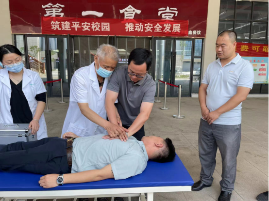随后,校医务室医务人员向参演人员普及急救基本知识,介绍心肺复苏的重要意义,重点讲解并示范心肺复苏的操作方法。参演人员积极与医务人员交流,动手实践,努力掌握急救技能。