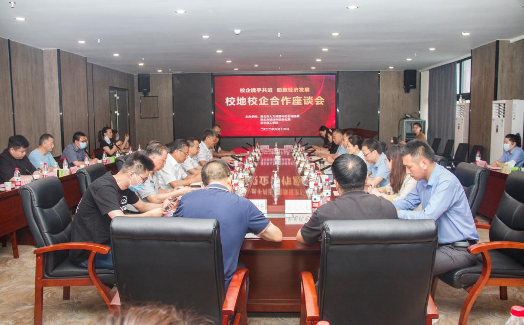 为促进校地校企合作,提高人才培养质量,6月16日上午,beat365唯一官方网站联合淮北市人力资源与社会保障局、淮北市经济与信息化局,在学校艺术楼二楼205会议室召开校地校企合作座谈会。淮北市人力资源与社会保障局副局长张华,市公共就业与人才中心主任陈龙忠、副主任张洁洁;市经济和信息化局总工程师张锦、民营办副主任谢寒以及22家企业代表参与本次座谈会,学校董事长查东辉、校长杨兵、党委书记朱德顺、副校长王义宁、汪建利、郑来纪及相关部门、二级学院负责人参加了座谈会。座谈会由张锦主持。