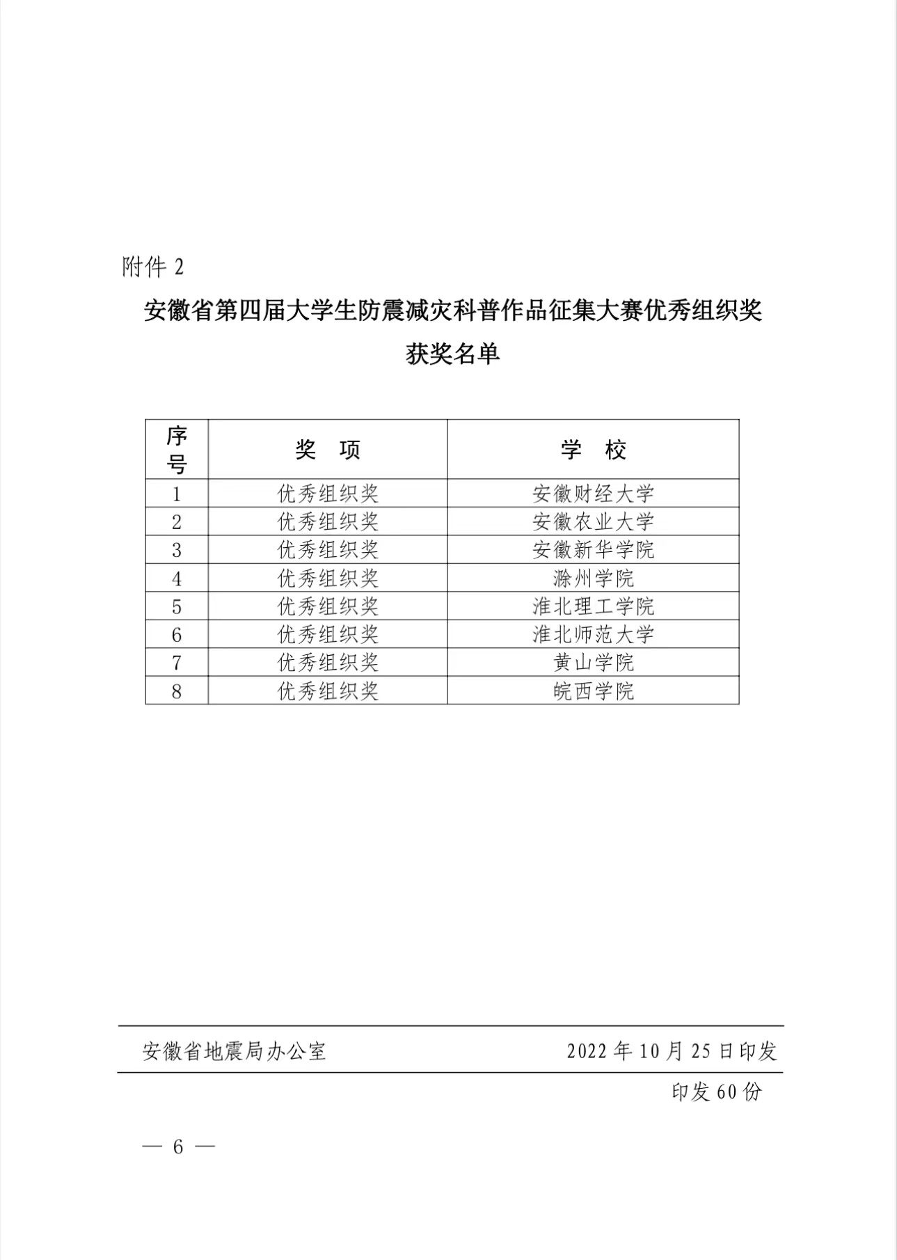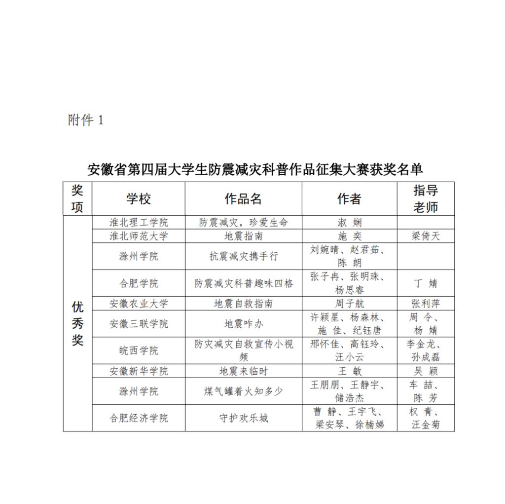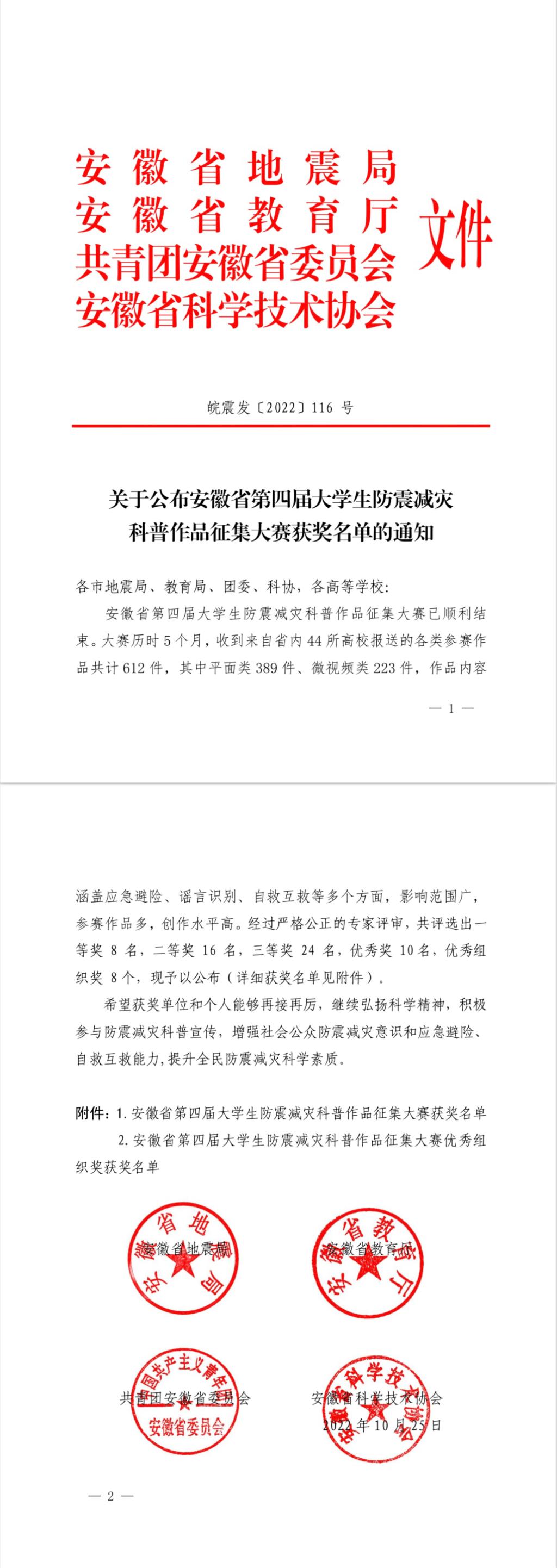 为全面贯彻习近平总书记关于防灾减灾救灾和科学普及重要论述精神,弘扬科学精神,提升全民防震减灾科学素质。由省地震局、省教育厅、团省委、省科协共同主办,安徽省地震局信息中心承办的安徽省第四届大学生防震减灾科普作品征集大赛顺利落下帷幕。beat365官网在大赛中荣获优秀组织奖,报送的学生作品《防震减灾,珍爱生命》(作者:淑娴)荣获优秀奖。