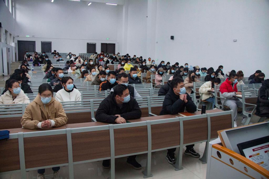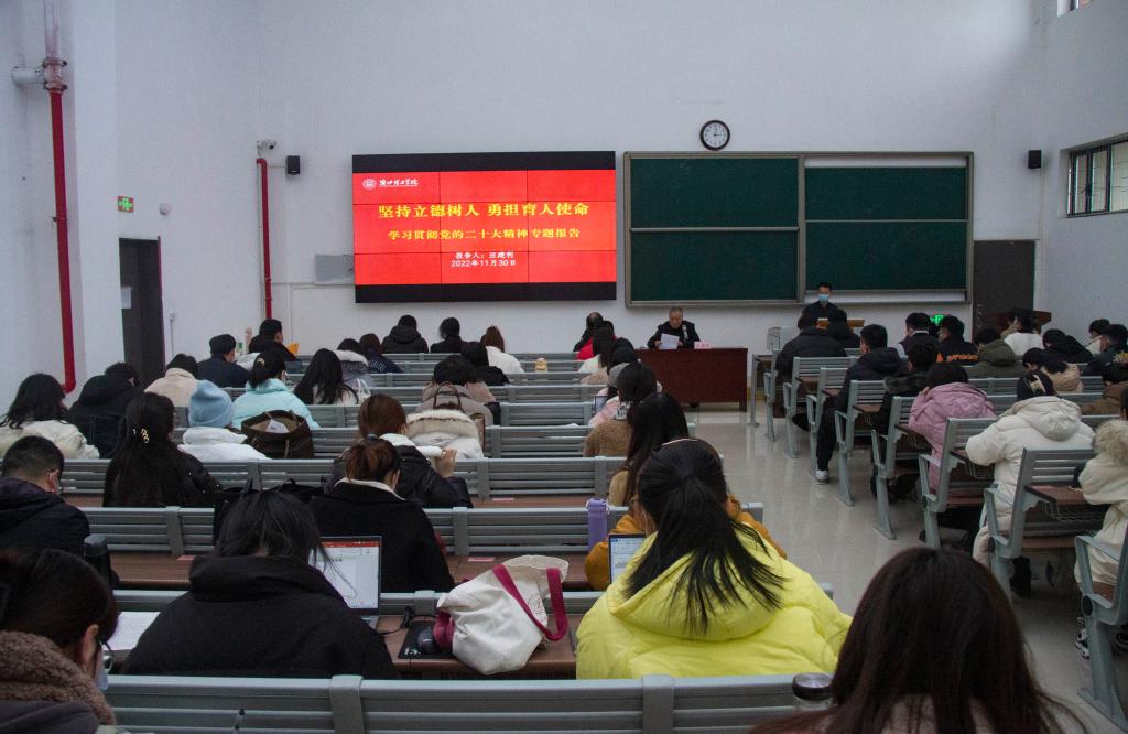 11月30日下午,校党委副书记、纪委书记、副校长汪建利在一教121教室宣讲党的二十大精神。学校全体青年教师聆听宣讲。