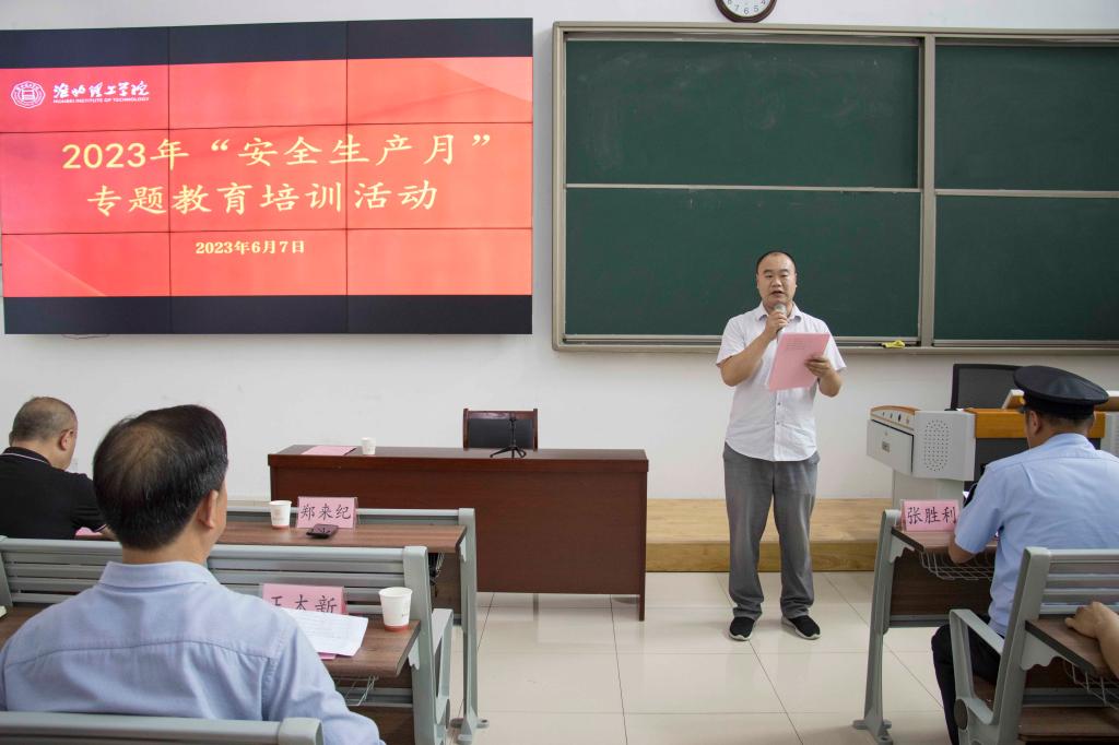 6月7日下午,beat365官网开展“安全生产月”专题教育培训,杜集区市场监管局局长张胜利莅临学校指导。学生处、后勤保卫处、校长办公室主要负责人及各二级学院书记助理,食堂、物业、商业街等第三方服务人员以及学生代表200多人参加活动。