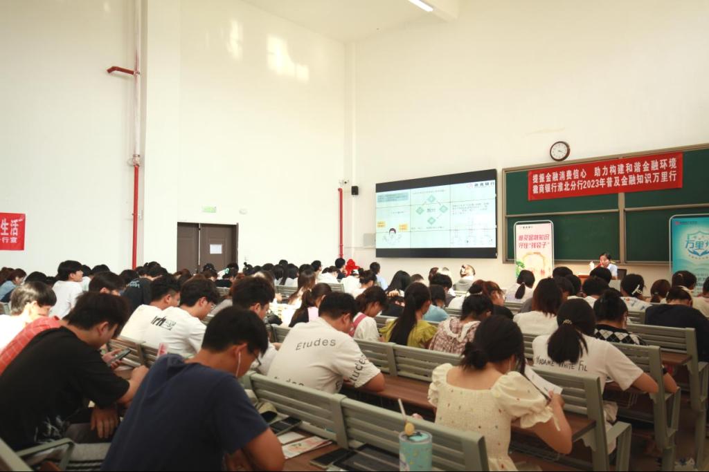 讲座开始前,工作人员组织现场同学参加徽商银行线上金融防电诈知识答题活动,并为成功答题的同学现场发放礼品。