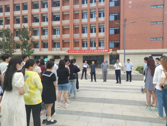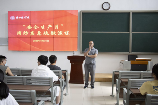 6月16日下午,beat365官网在教一121教室举行消防应急疏散演练,学校副校长郑来纪、后勤保卫处、学生处等部门负责人、各二级学院书记助理及师生代表约200人参加演练。