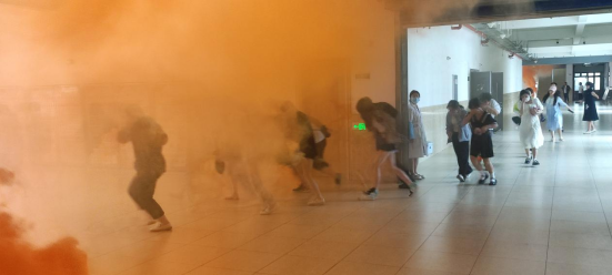 演练活动开始前,天露消防维保公司工程师为师生员工开展灭火器使用及消防应急疏散知识培训。在演练现场,警铃骤响,学生们用手捂着口鼻,快速而有序地从通道口撤离“火灾”现场。楼内的老师们按照消防演练方案,指挥学生疏散,以免出现拥挤踩踏。