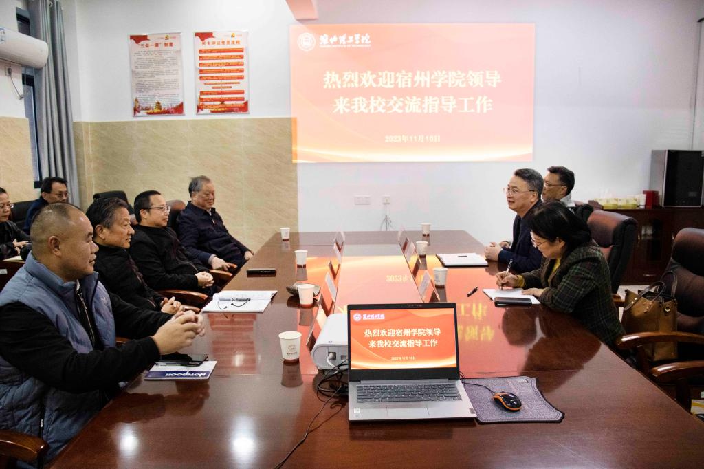 为进一步加强校际间合作交流,促进资源共享,11月10日下午,宿州学院党委副书记、院长李福华一行3人来beat365官网交流指导工作。beat365官网董事长查东辉、党委书记朱德顺、副校长汪建利和副校长郑来纪等领导热情接待了李福华一行并进行座谈。