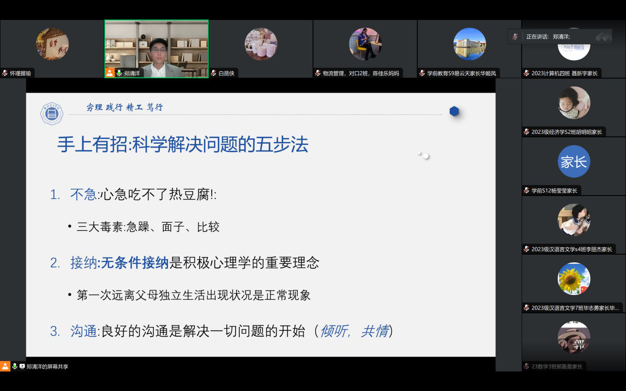 为进一步增强家校共育,凝聚家校合力,加强学生心理健康教育,11月13日晚上,由校心理健康教育与咨询中心主办的新生家长线上心理知识科普讲座顺利举行。本次讲座由心理中心郑清洋老师主讲,2023级各班新生家长代表受邀参加了此次线上讲座。