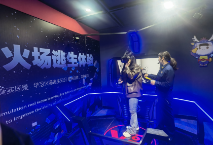 在互动体验区域,同学们饶有兴趣地对消防标识识别区、电气火灾实验区、模拟灭火体验区、模拟119报警体验区、VR逃生体验区等进行观摩和体验。