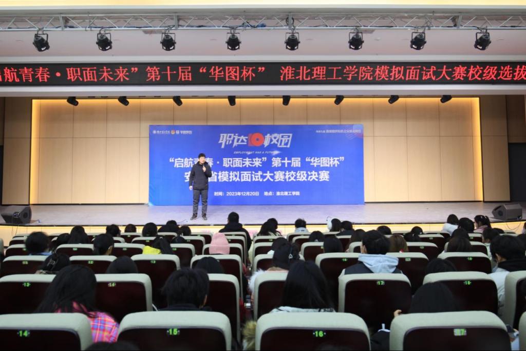 华图教育科技有限公司淮北分公司校长权丹总结讲话,指出本次大赛旨在锻炼学生的学习能力、演讲能力、应变能力,参赛选手要自信展示自我、坚定目标,强化就业意识、明确就业发展方向,提升就业竞争力,推动实现更加充分更高质量就业。