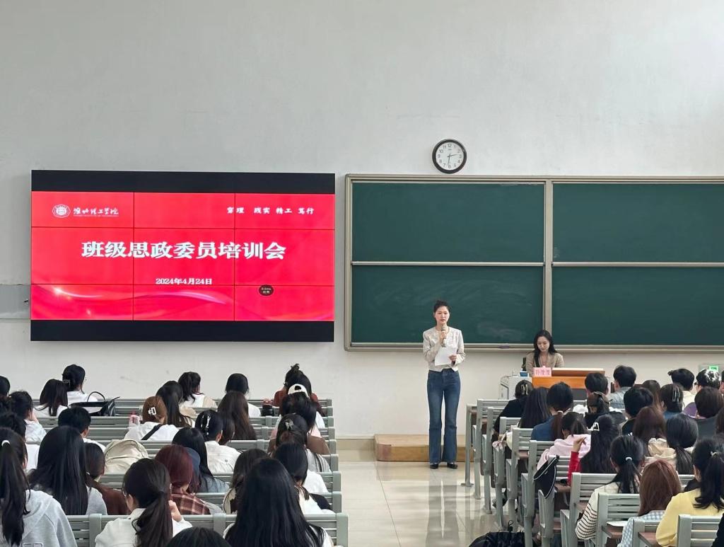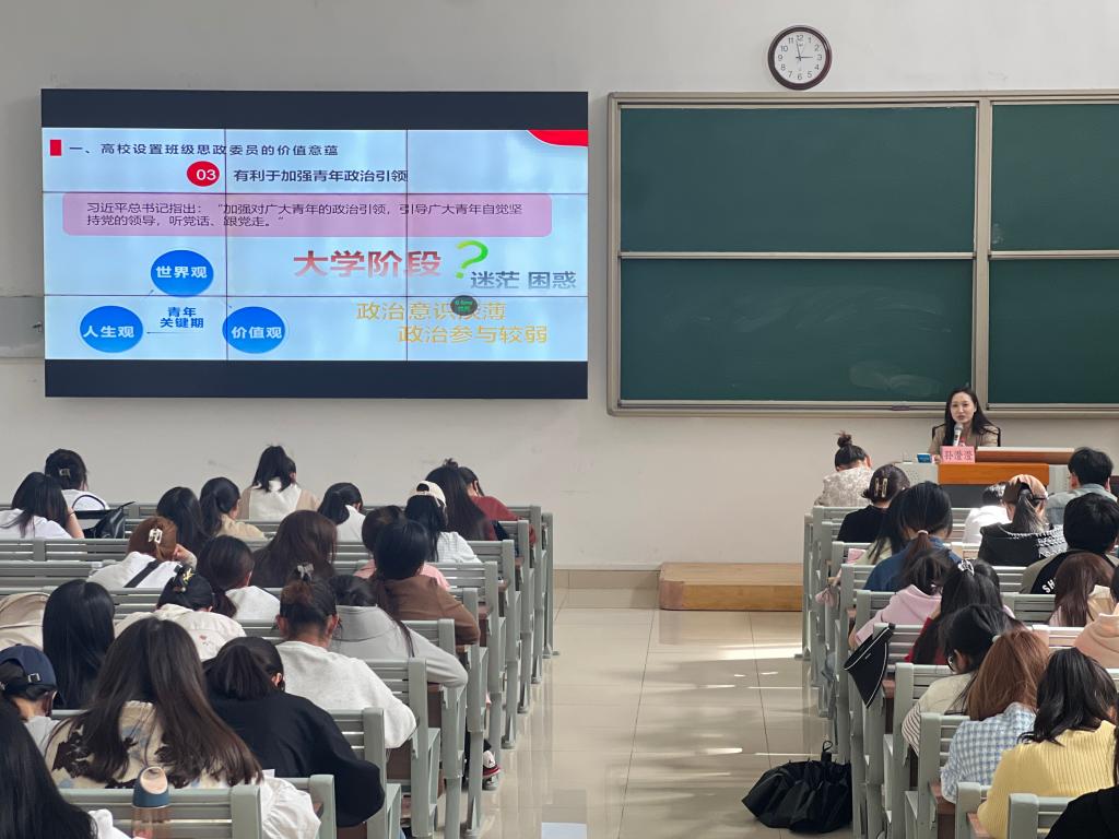 4月24日下午,学校在一教121教室举办全校班级思政委员培训会。马克思主义学院专任教师、纲要教研室主任孙澄澄担任主讲,为全校各班级思政委员作专题培训。培训会由学生处张敬茹主持。