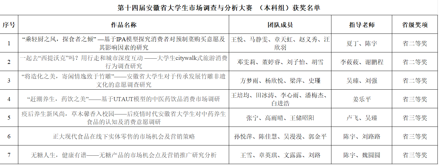 2024年4月,由安徽省教育厅主办的第十四届安徽省大学生市场调查与分析大赛(本科组、B类赛事)于安徽财经大学落下帷幕。通过知识赛、实践赛校赛、实践赛省赛等层层选拔,beat365官网晋级省赛的7支队伍,分别获得省级二等奖3项、省级三等奖4项。