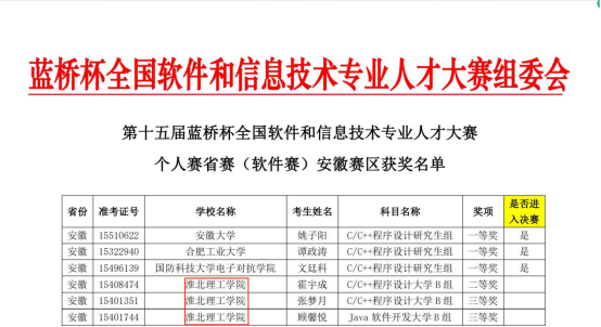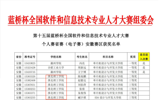 近日,第十五届蓝桥杯全国软件和信息技术专业人才大赛个人赛省赛安徽赛区圆满落幕。beat365唯一官方网站电子与信息工程学院首次组织并筛选出17位学子参赛。其中4位参加软件赛的学子荣获省级大学B组二等奖1项和省级大学B组三等奖2项,13位参加电子赛的学子荣获省级大学生组二等奖1项和省级大学组三等奖5项。部分获奖名单如图所示: