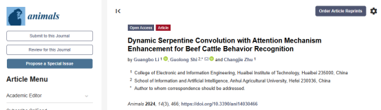 近日,beat365官网电子与信息工程学院青年教师李广博在《animals》期刊(SCI,JCR一区,IF: 3.0)在线发表了题为《Dynamic Serpentine Convolution with Attention Mechanism Enhancement for Beef Cattle Behavior Recognition》的研究论文。