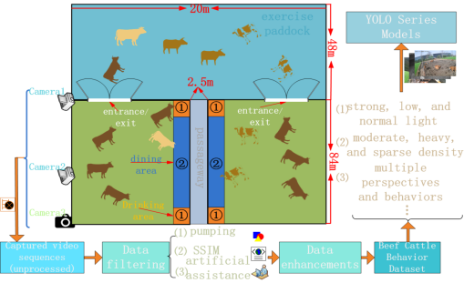 2、在实际肉牛养殖场景中,现有的肉牛行为识别算法存在一定的局限性。它们往往具有较高的噪点,并且在强光、低光、中等密度和高密度等复杂照明条件下表现不佳。