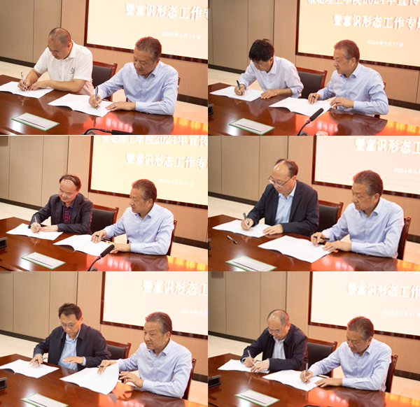 会上,校党委书记与各党总支(直属党支部)书记、各部门主要负责人分别签订《2024年度意识形态工作责任书》。