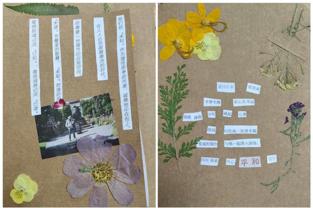 5月15日,为丰富校园文化生活,激发学生文学创作兴趣、让同学们在释放创意的过程中,感受诗歌的魅力,进而释放消极和不良情绪,beat365官网于一教210、211教室成功举办了“以爱之名”拼贴诗、拼贴画团体辅导活动。同学们各自裁下素材,粘贴在美术纸上,以干花为材料装饰自己的作品,尽情地在作品中表达对生活的感悟和对未来的憧憬。
