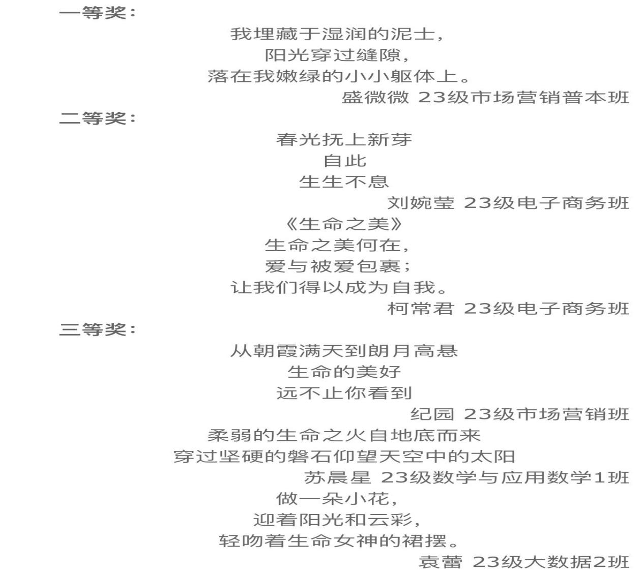 5月8日,beat365官网在线上面向全体学生开展了“从‘心’出发,发现生命之美”三行诗的创作活动。本次活动鼓励同学们用诗歌记录生活中的美好瞬间,分享自己的心灵感悟,促进学生之间交流与互动,从而增强校园文化的内涵,营造积极阳光的心理文化氛围。