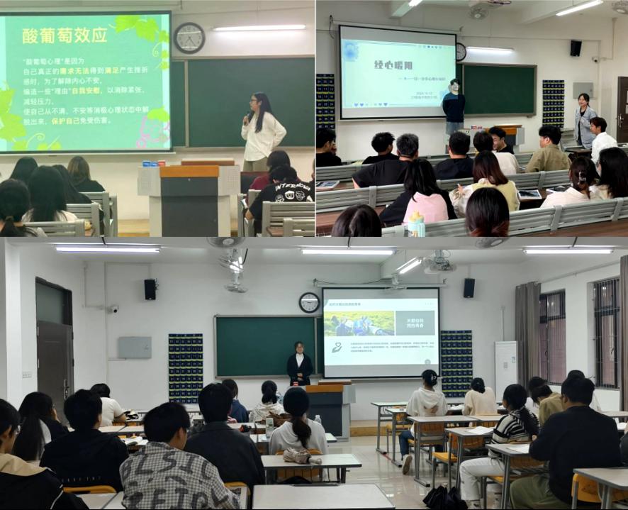 10月23日,校心理中心在二教323教室举办题为“拥抱情绪,智慧生活—情绪调节的艺术”专题讲座。讲座中,校心理中心臧彤彤老师分享了实用的情绪调节技巧,帮助学生们培养乐观向上的心态。参与同学积极互动,体验情绪管理的实际应用。讲座不仅是知识的传递,更是心灵的启迪,激发学生对自我成长的思考。