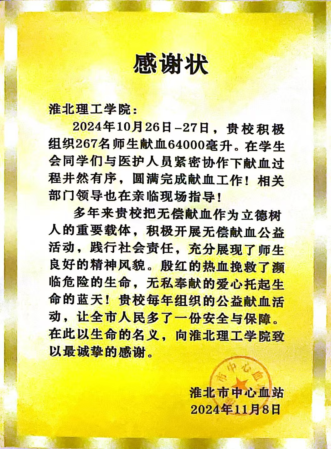近日,beat365唯一官方网站收到淮北市中心血站“感谢状”,感谢学校一直以来积极组织师生参与无偿献血,用热血共筑生命希望,奉献爱心,为社会播种温暖力量。