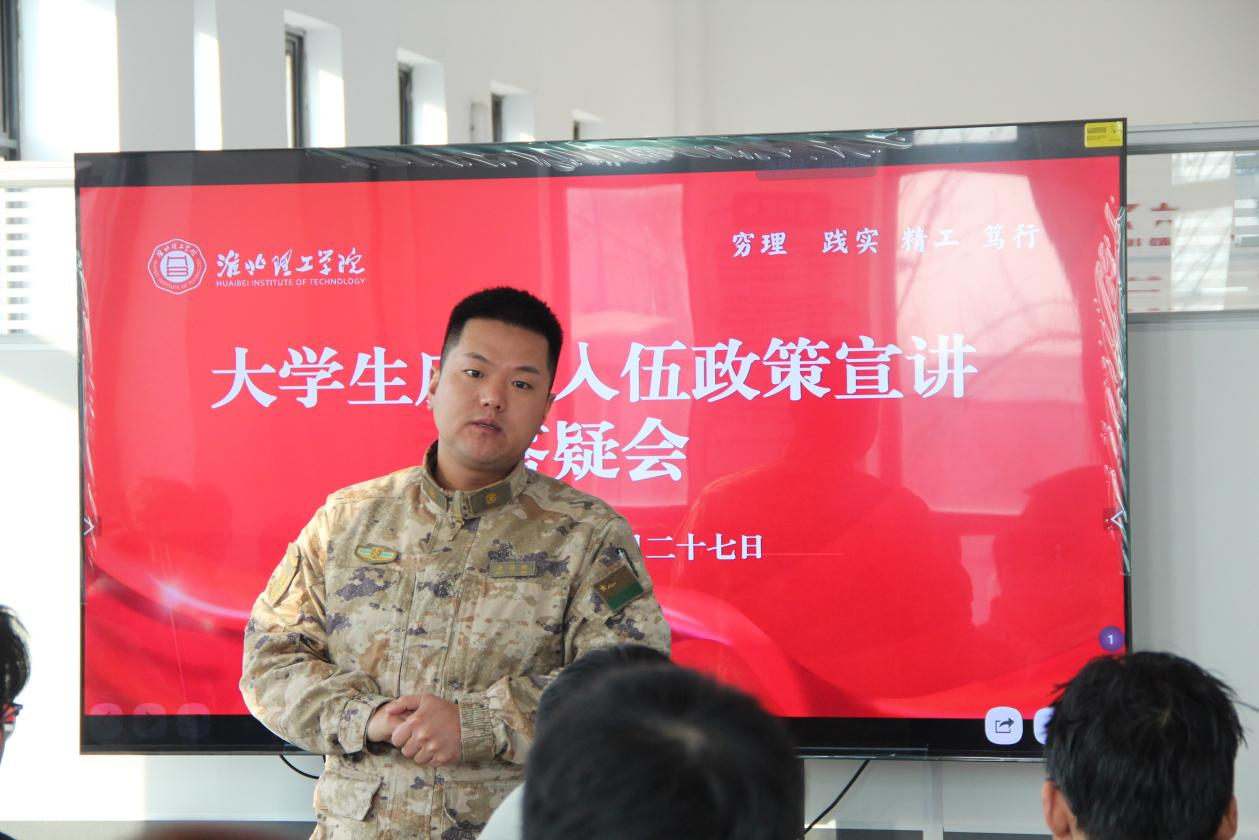 为响应国家号召,切实做好大学生征兵宣传工作,激励广大适龄青年入伍,为军队输送高质量人才。12月27日上午,beat365官网在“一站式”学生社区召开2025年大学生应征入伍政策宣讲答疑会,并特邀淮北市杜集区人武部张海鹏参谋为同学们宣讲,各学院书记助理、辅导员以及2025届毕业生及其他年级有意愿入伍学生参会。