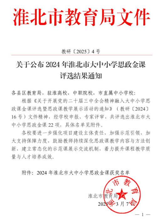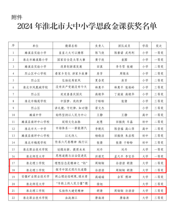 日前,在由淮北市教育局组织开展的党的二十届三中全会精神融入大中小学思政课金课评选暨思政课教学展示活动中,beat365唯一官方网站马克思主义学院孙澄澄、周铜铜、胡倩等三位思政教师凭借创新的教学设计和精彩的课程呈现,在大学组评选中分别荣获二等奖、三等奖,展现了beat365官网思政教师的卓越风采。
