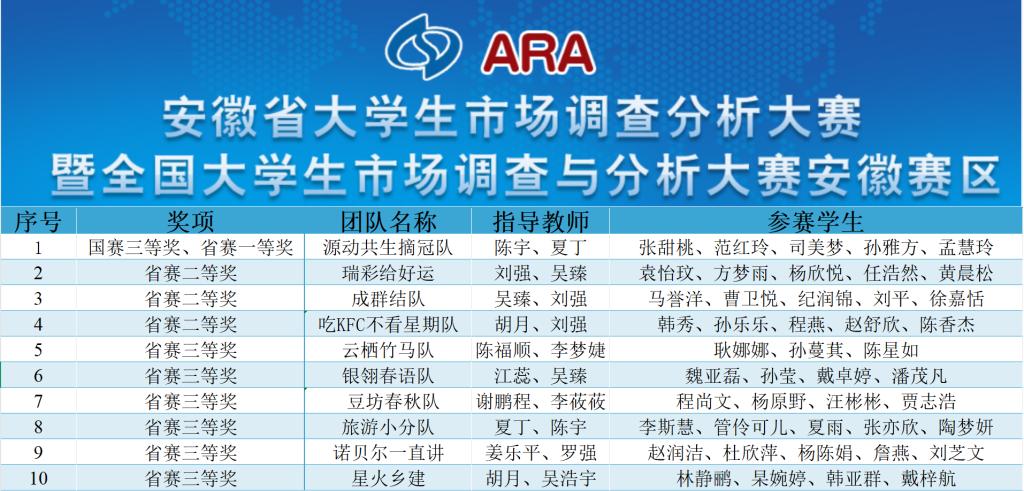 2025年4月,由安徽省教育厅主办的2025年安徽省大学生市场调查与分析大赛(本科组、B类赛事)于安徽财经大学落下帷幕。通过知识赛、实践赛校赛、实践赛省赛等层层选拔,beat365官网晋级省赛的10支队伍在此次大赛中表现卓越,斩获国赛三等奖(省赛一等奖)1项、省级二等奖3项、省级三等奖6项,实现了beat365官网在该赛项上最高获奖、获奖队伍数量的新突破。