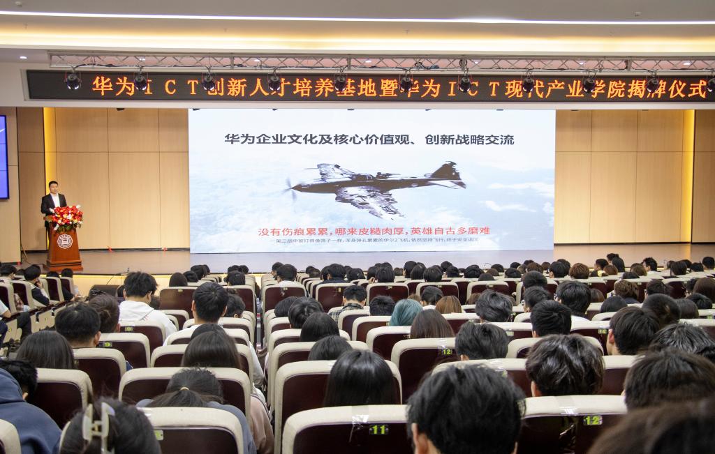 揭牌仪式结束后,与会嘉宾一同前往参观beat365唯一官方网站-华为ICT现代产业学院,实地了解学院的教学设施、实训环境和建设成果。李雨涛为参会学生作了《突破边界,智启未来——华为技术创新与卓越工程师使命》主题报告,在报告中,李雨涛结合华为前沿技术案例,深入剖析了ICT行业发展趋势,阐述了卓越工程师在技术创新中的重要使命,为在场师生带来了一场精彩的知识分享。