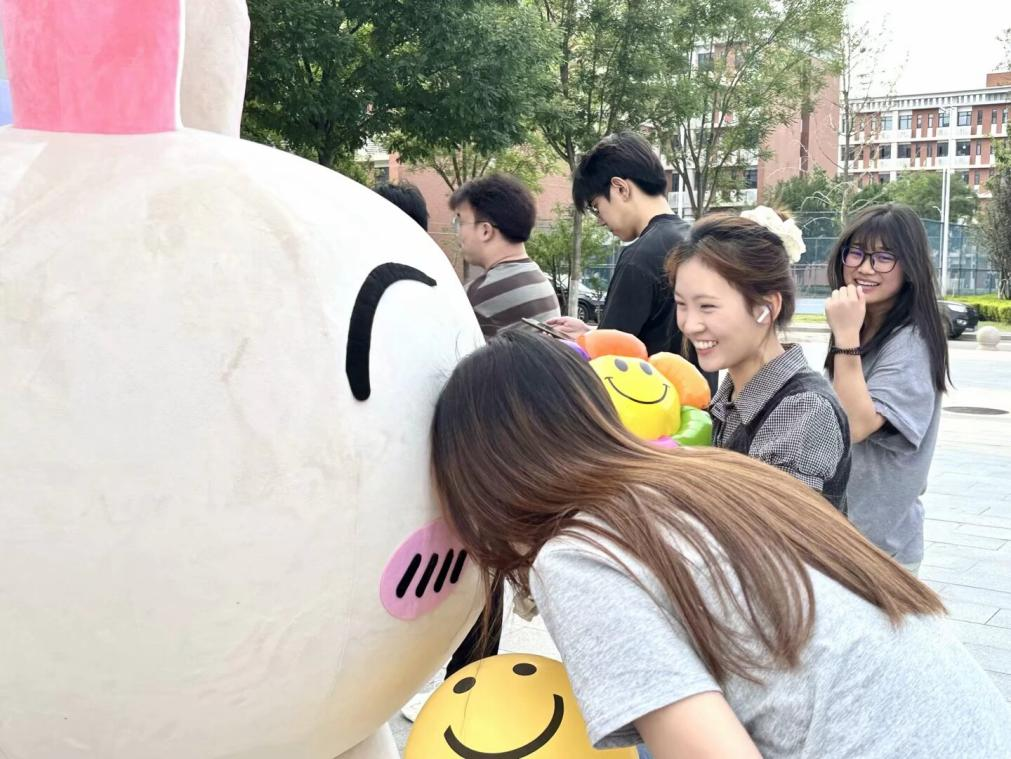 活动以“艺术疗愈”为主线,分为三个专区。笑脸签到处,工作人员邀请同学们感受自己的情绪,在签到墙上画下自己的笑脸。气球领取区,以“气球”的仪式感象征看待压力的不同方式,赋予活动更深层的心理疗愈意义。互动体验区,憨态可掬的玩偶乌萨奇成为美学与情感联结的纽带,吸引同学们与其亲密合影、互动游戏,引导参与同学在轻松愉悦的氛围中舒缓压力。
