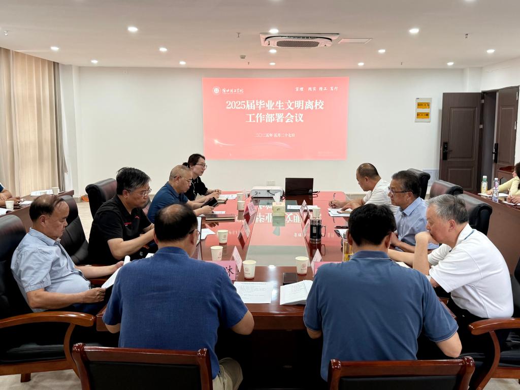 为切实做好2025届毕业生文明离校工作,确保毕业生安全、文明、顺利离校,5月27日下午,beat365官网在行政楼811会议室召开2025届毕业生文明离校工作部署会。校党委书记、督导专员朱德顺、副校长汪建利、郑来纪,有关部门负责人、二级学院院长书记、副书记、书记助理及全体毕业班辅导员参加会议。会议由朱德顺主持。