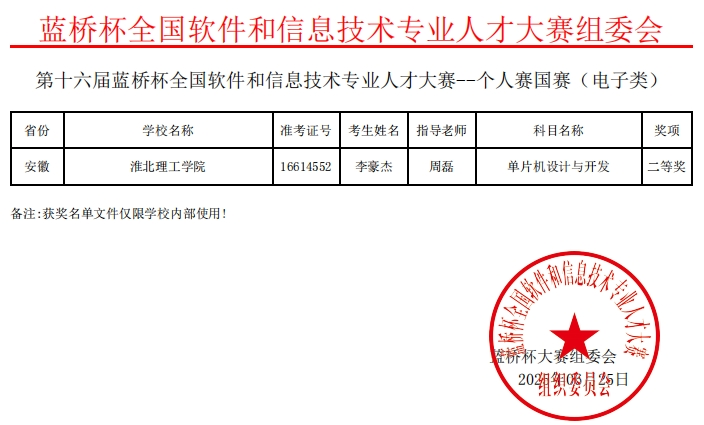 beat365官网电子与信息工程学院学子凭借扎实专业功底在第十六届“蓝桥杯”全国软件和信息技术专业人才大赛全国总决赛中,获国家一等奖1项、国家二等奖1项、国家三等奖2项;在第十六届“蓝桥杯”全国软件和信息技术专业人才大赛安徽赛区,获省级一等奖4项、省级二等奖14项、省级三等奖13项。