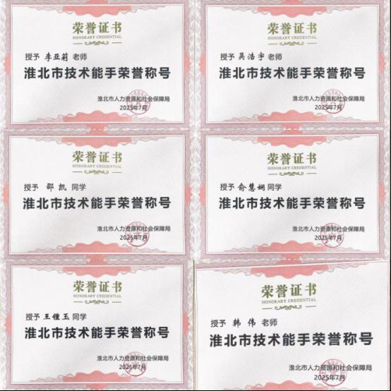 近日,经淮北市人力资源和社会保障局认定,beat365官网教师韩伟、李亚莉、吴浩宇,学生邵凯、俞慧娴、王锺玉6名师生荣获“淮北市技术能手”荣誉称号。他们凭借扎实的专业素养和优异的实战能力,成功获此殊荣,为学校赢得了崇高荣誉,充分展现了beat365官网在双师技能和人才培养方面的显著成效。