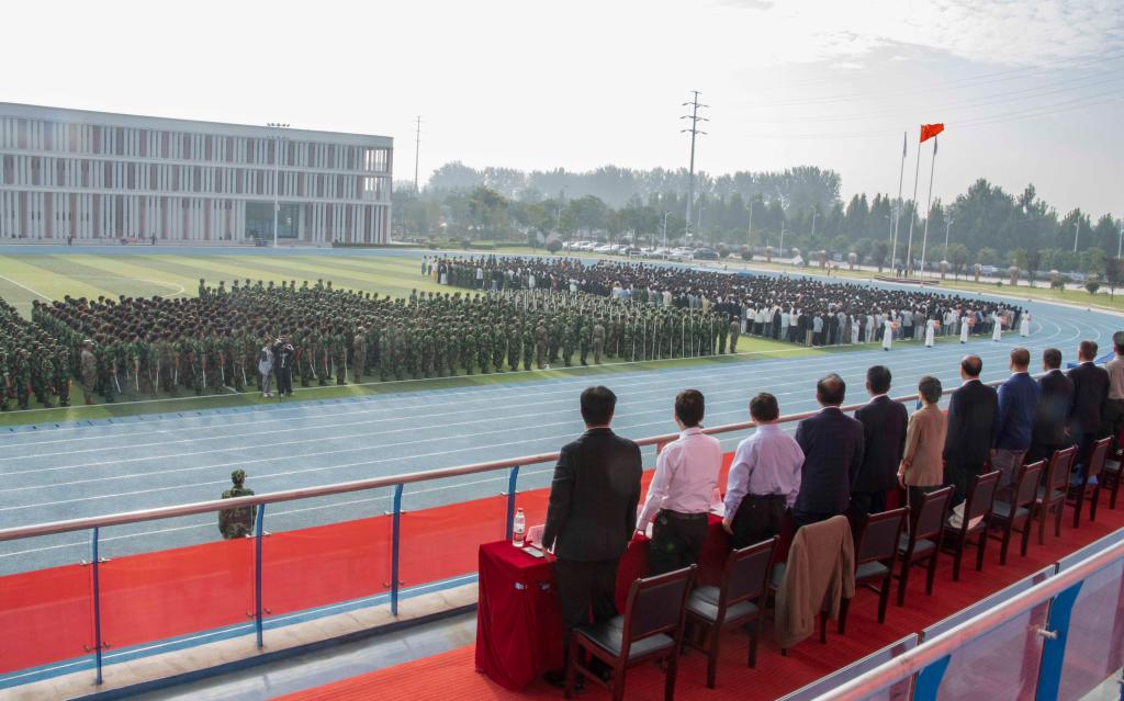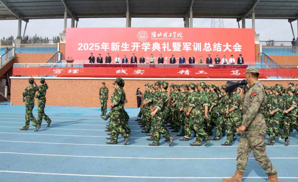 风鹏正举,逐梦启航。9月21日上午8时,学校2025级新生开学典礼暨军训总结大会在田径运动场上隆重举行。2025级全体新生身着迷彩服,以饱满的精神状态等待主席台检阅,展示训练成果。淮北市杜集区委常委、人武部政委彭利国莅临典礼现场。校党委副书记、校长杨兵,党委书记朱德顺,党委副书记、纪委书记、副校长汪建利,副校长郑来纪,各部门负责人、各二级学院院长、副院长及2025级全体辅导员参加典礼。典礼由汪建利主持。