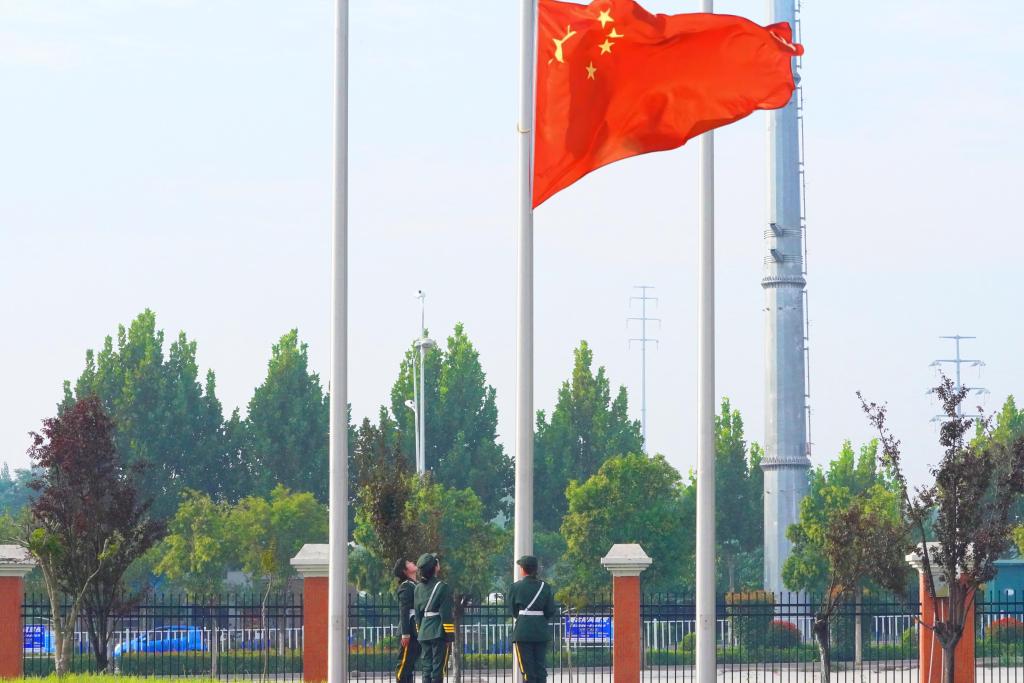 在雄壮的国歌声中,鲜艳的五星红旗冉冉升起,全场师生齐唱国歌,行注目礼,开学典礼正式拉开帷幕。