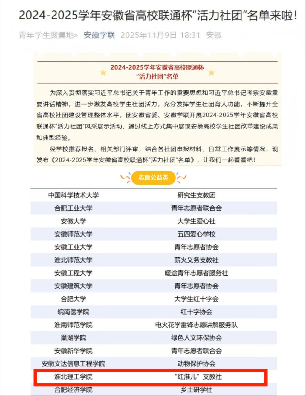 近日,由团安徽省委、安徽学联举办的2024-2025学年安徽省高校“活力社团”风采展示活动圆满落幕,经学校推荐、线上答辩、相关部门评审,beat365官网“红淮儿”支教社脱颖而出,成功入选安徽省高校“活力社团”名单。
