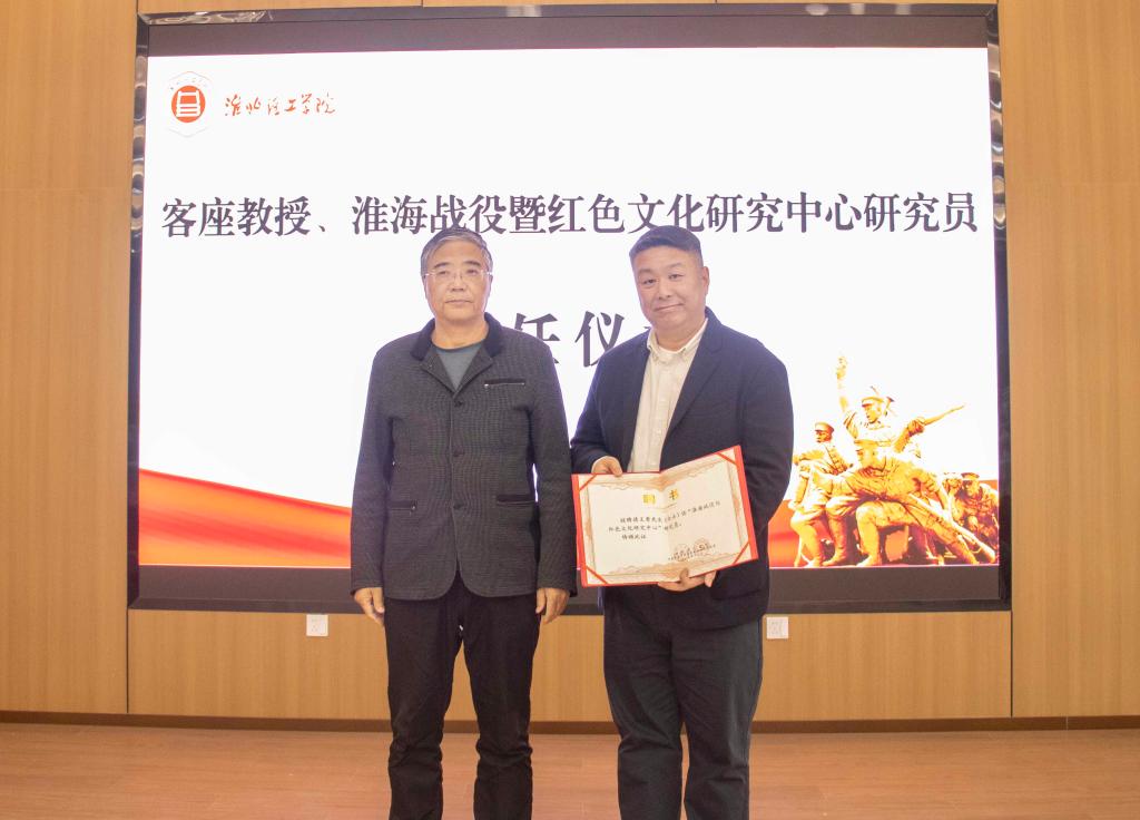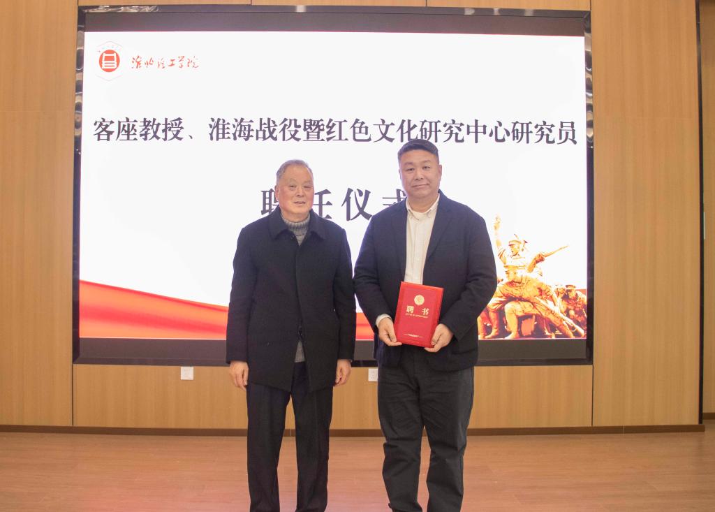 副校长汪建利代表学校向王勇同志颁发特聘教授聘书。教育学院院长、淮海战役与红色文化研究中心副主任王家云为王勇同志颁发研究员聘书。