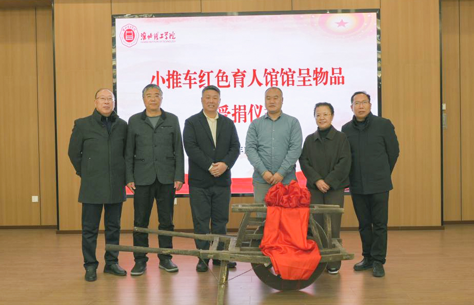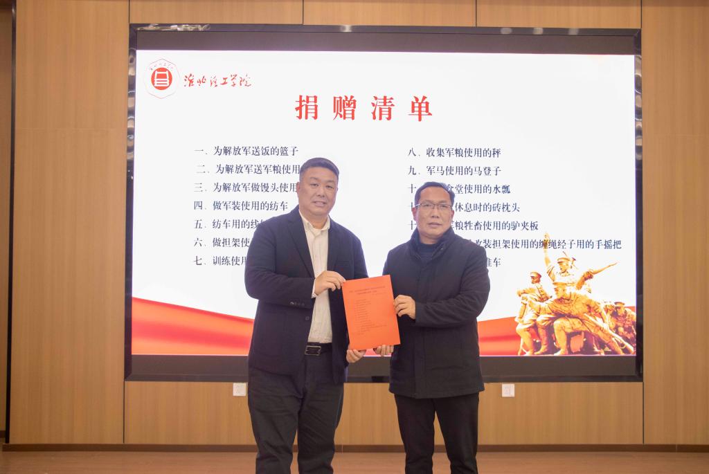 马克思主义学院副院长刘奔前代表学校接受捐赠。本次捐赠物品包括支前小推车、送饭篮子、送军粮笆斗等14类珍贵实物,生动还原了淮海战役中的支前场景,为小推车红色育人馆的建设与学校红色文化教育的深入开展提供了重要实物资源。