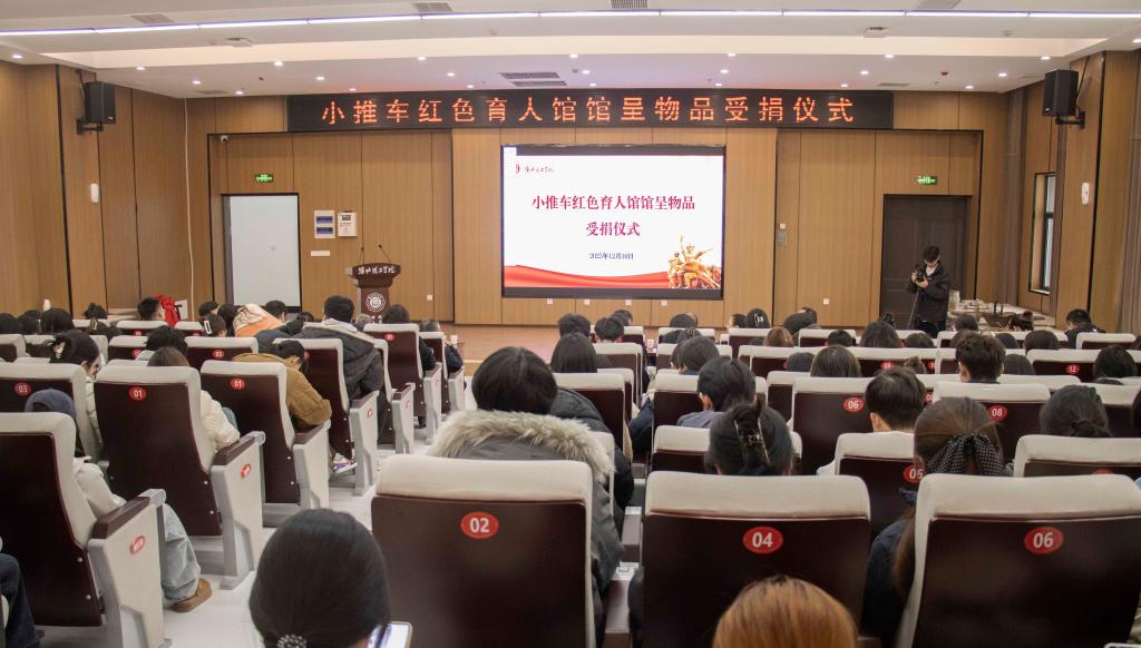 12月10日15时,学校在图书馆106报告厅隆重举行小推车红色育人馆馆藏物品受捐仪式。永城市供电公司党建部主任、永城市摄影家协会主席王勇同志,人民摄影报光与影艺术中心主任、徐州市摄影家协会副主席尤良怀同志向学校捐赠馆呈文物。王勇同志亲临现场捐赠珍贵文物并出席仪式。校党委书记朱德顺,副校长汪建利、郑来纪,相关部门负责人、马克思主义学院教师代表、经济与管理学院辅导员及学生代表参加活动。活动由党建办主任付金沐主持。