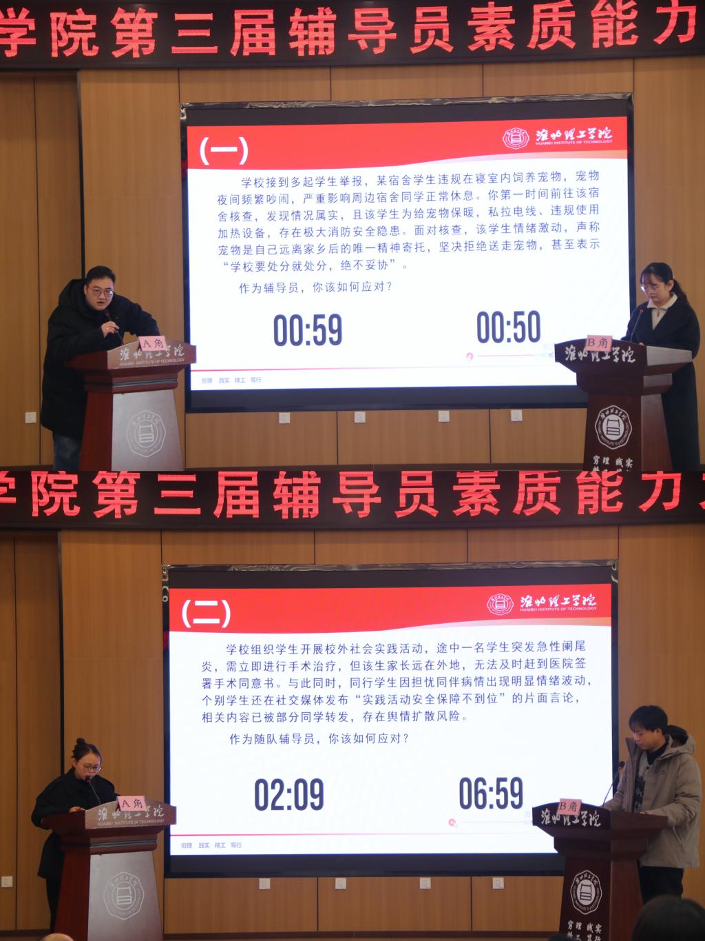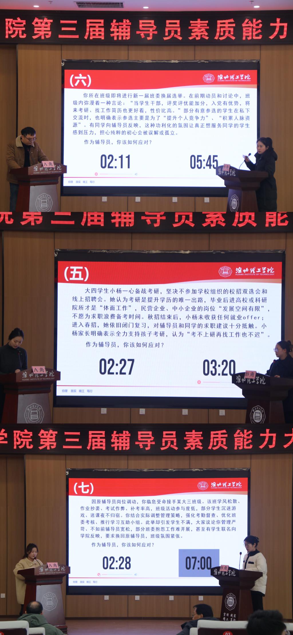 “案例研讨”环节以“我提问,你回答”的方式展开,选手两两成组,围绕抽取的学生思想政治教育、学业困难帮扶、心理健康教育、危机事件应对、就业指导等典型工作案例,交替进行提问与阐述。选手们综合运用相关理论和工作经验,深入分析问题本质、精准研判风险、科学提出解决方案,充分展现了其逻辑思维、分析研判和协同解决问题的能力。
