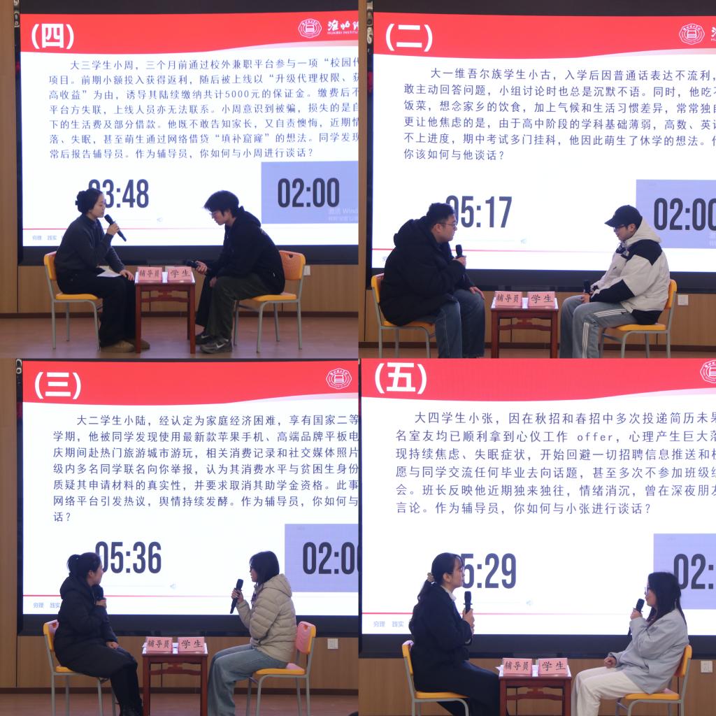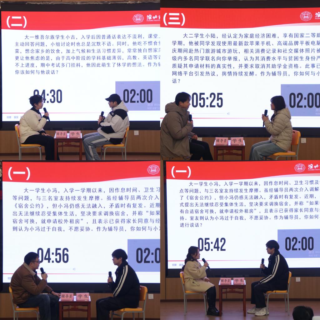 “谈心谈话”环节则高度模拟真实工作场景。由学生干部扮演遇到思想困惑、学业压力、人际冲突、情感问题等不同情境的学生,选手们需在有限时间内与“学生”进行面对面沟通。谈话过程中,辅导员们展现出良好的共情能力、沟通技巧和教育引导艺术,有效疏导学生情绪,提出切实可行的建议,体现了立德树人的情怀与智慧。