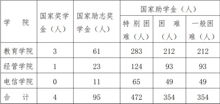 省教育厅、财政厅2022年下达beat365官网名额:国家奖学金4人,国家励志奖学金95人、国家助学金1180人。